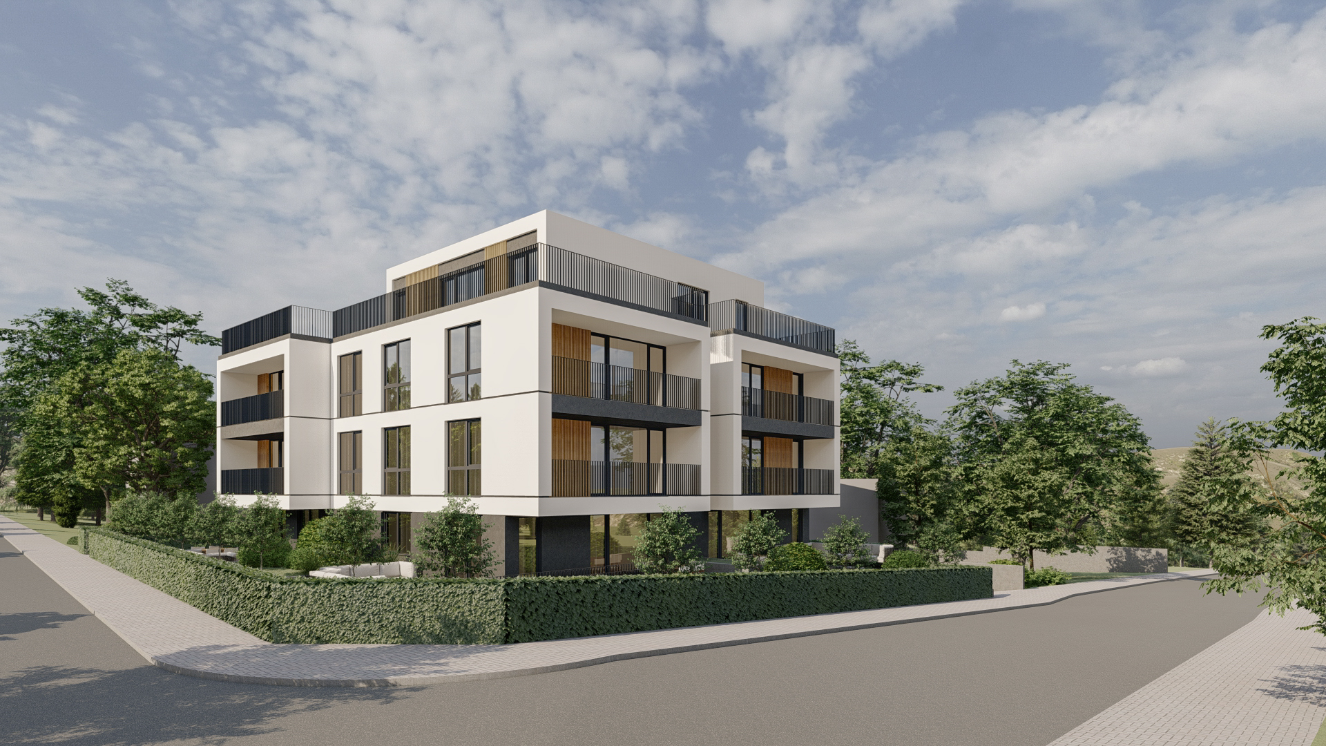 В композицията на сградата, ясно е изразено вертикално и хоризонтално членение, което е осъществено от стандартни за целта фасадни елементи. Изборът на цветовете и пропорционирането на отворите и плътните части по фасадите допълват образа на сградата, ясно подчертаващ жилищния ѝ характер. Потърсен е адекватен отговор на обкръжаващата среда и изложението на фасадите чрез по-отворени фасади на юг.