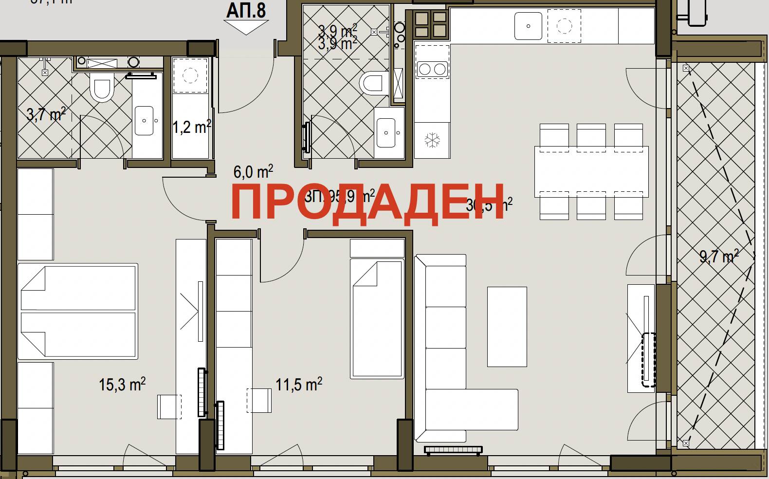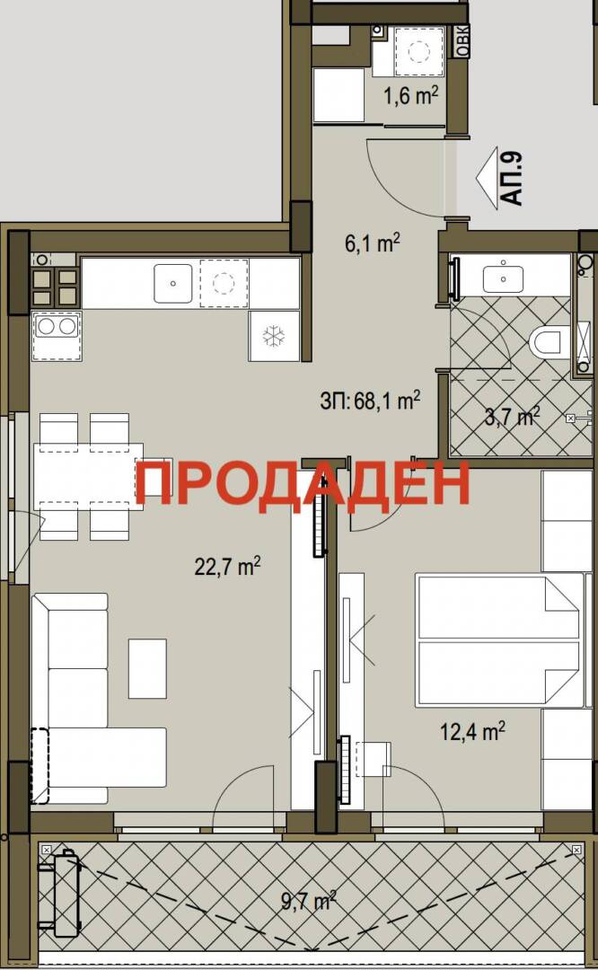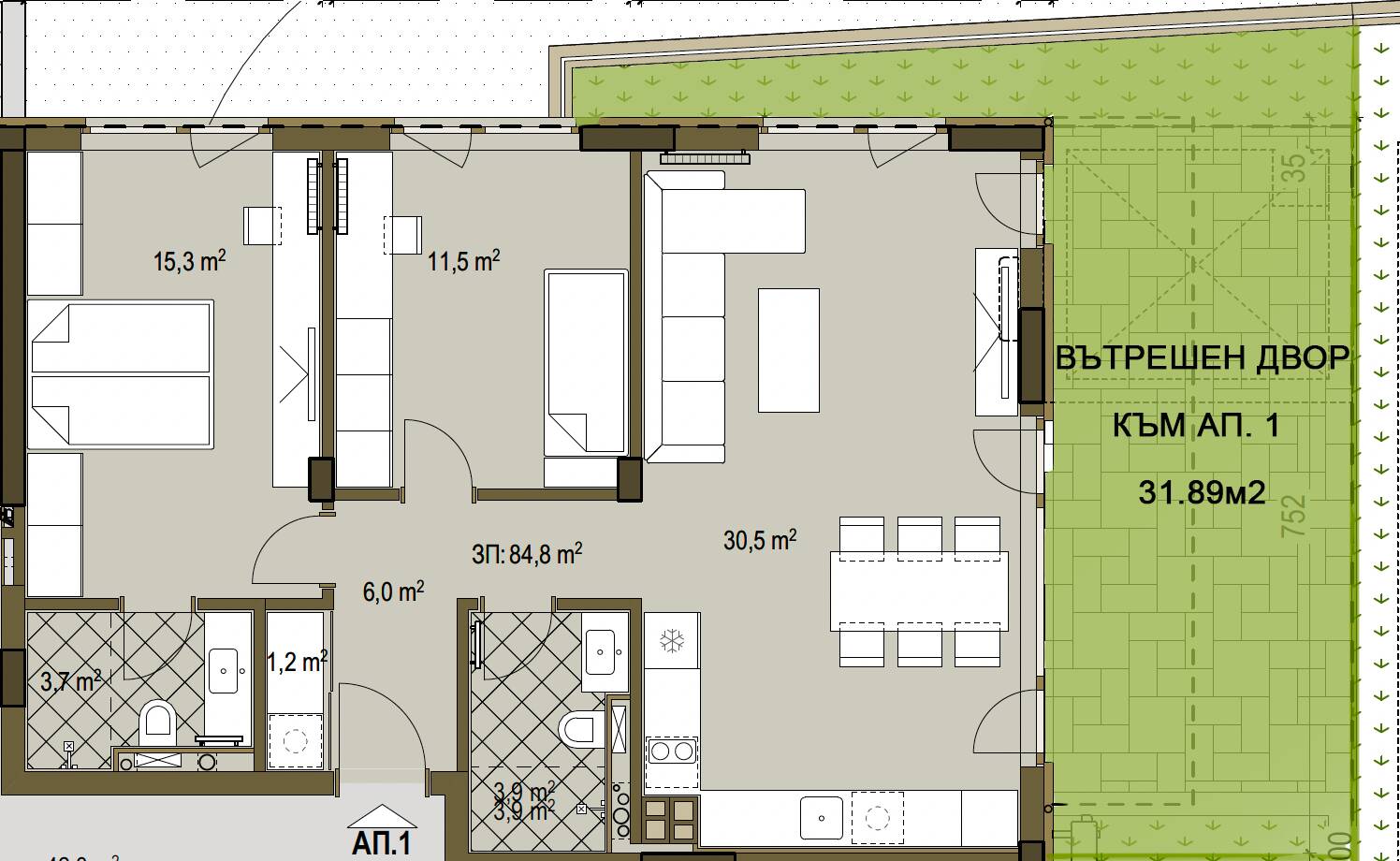 Сградата се състои от три надземни етажа, един подпокривен и един подземен. Проектирани се два типа апартаменти – 7 тристайни и 3 двустайни. Партерните апартаменти са с прилежащи двор-тараси. В сутеренния етаж са разположени 6 паркоместа и 4 гаража.