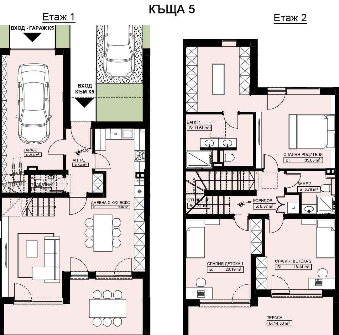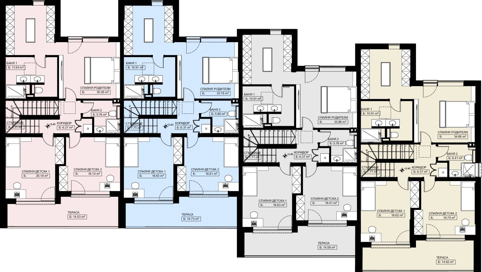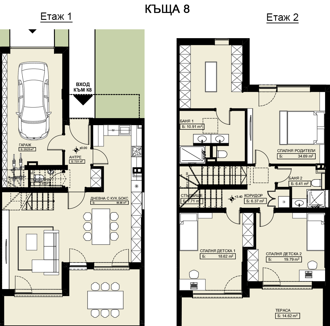 Всяка от тези къщи представлява съчетание между простор и уют, с разпределения, удовлетворяващи нуждите на модерните семейства. С площи ~ 230 кв.м., разпределени на два етажа.