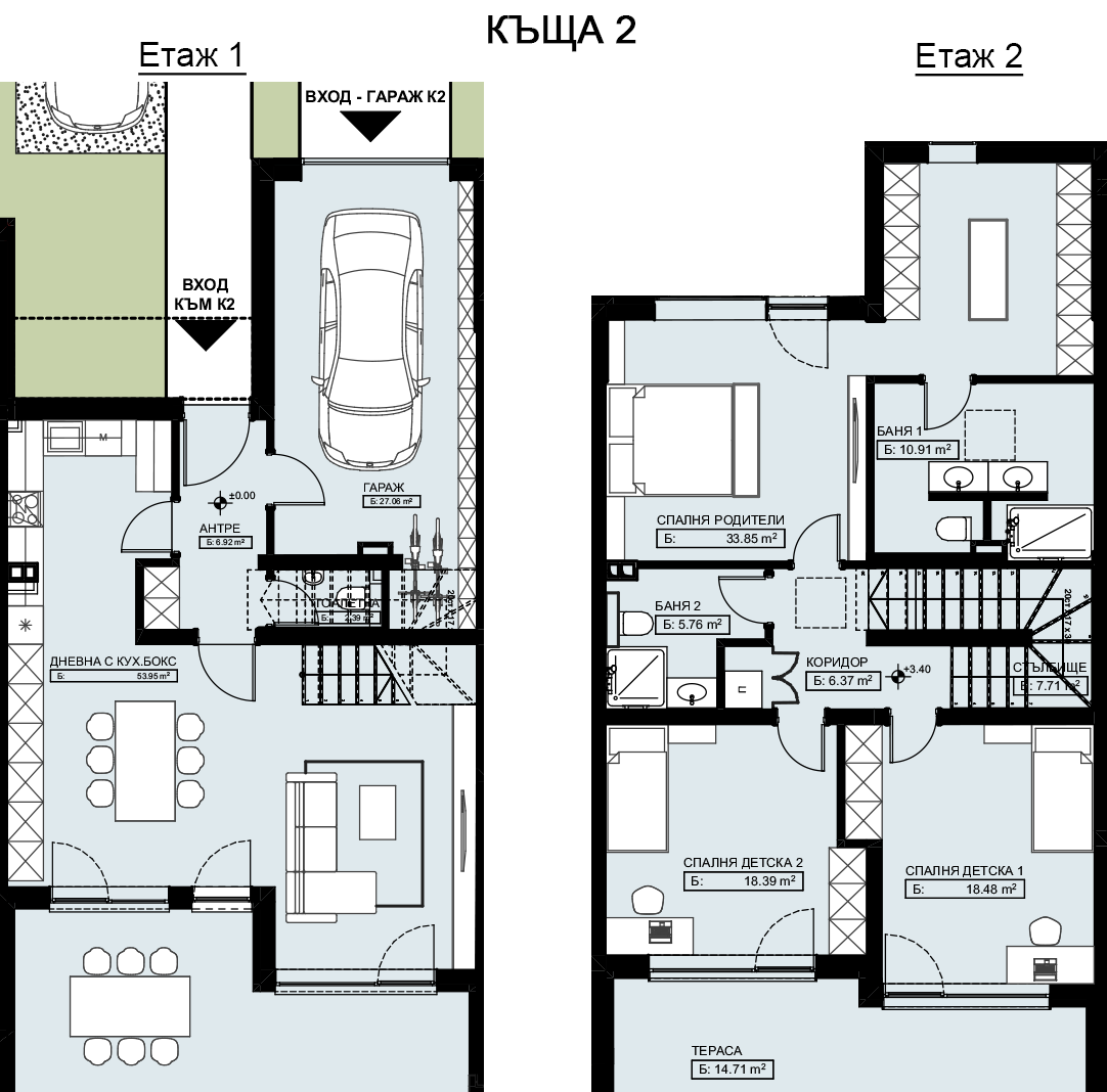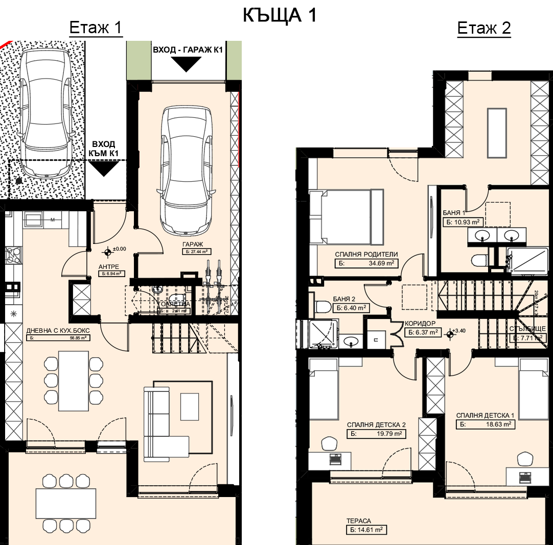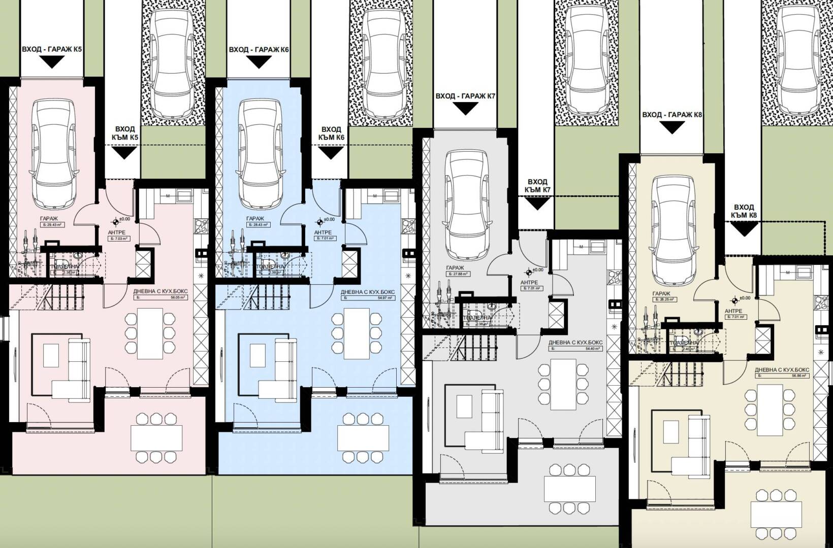 На първия етаж се разполагат гараж за удобно паркиране, антре, просторна дневна, кухня и тоалетна.