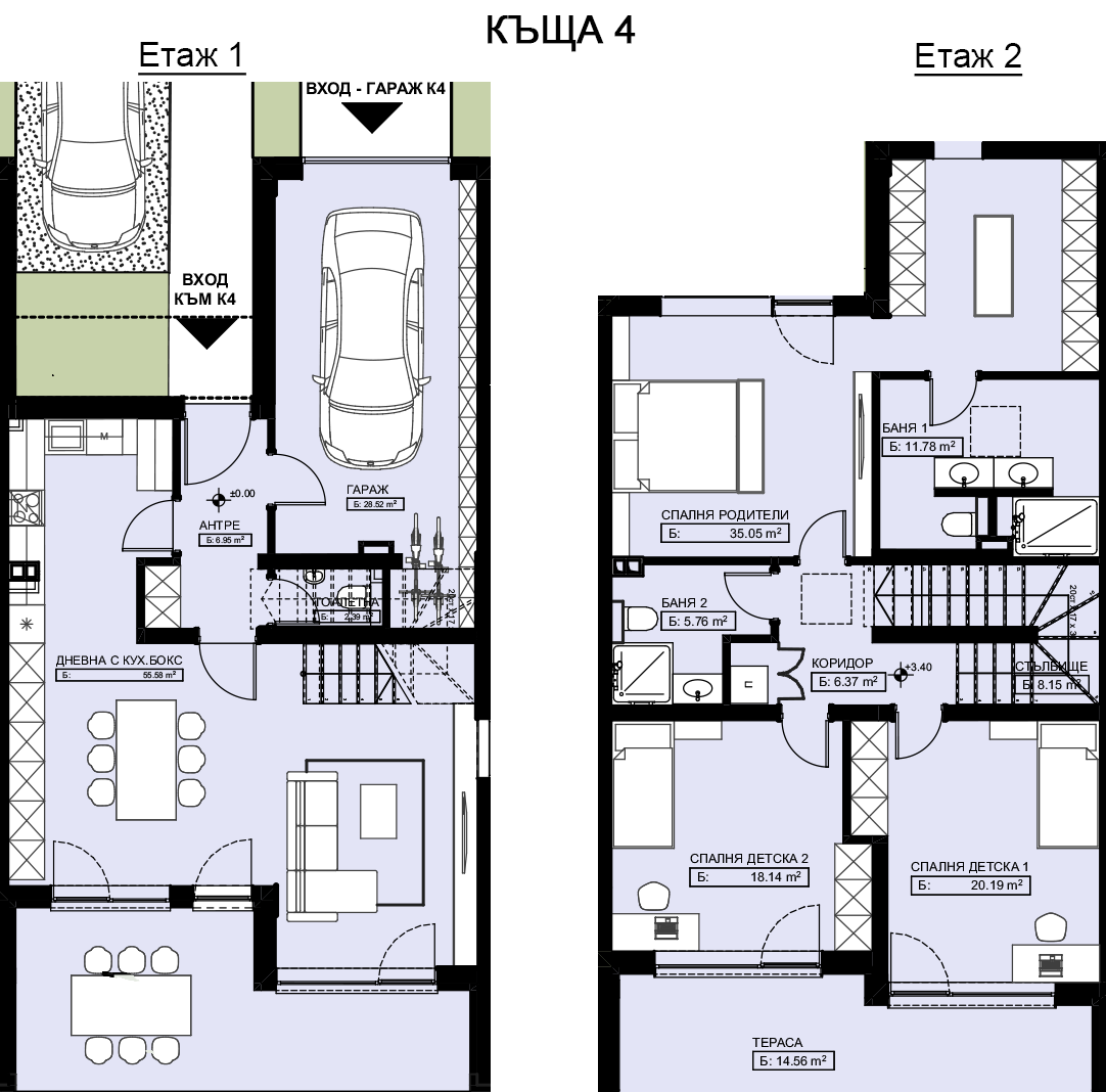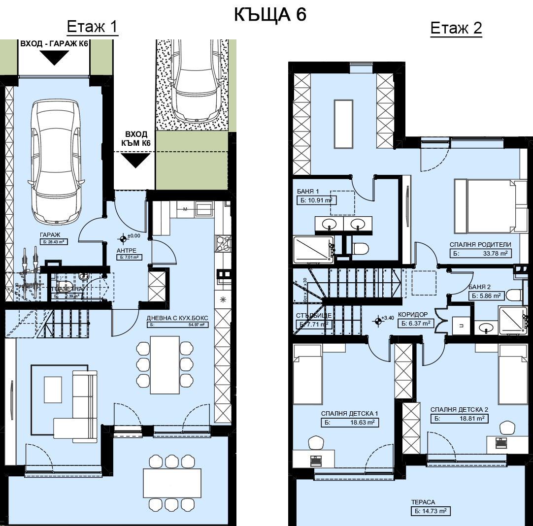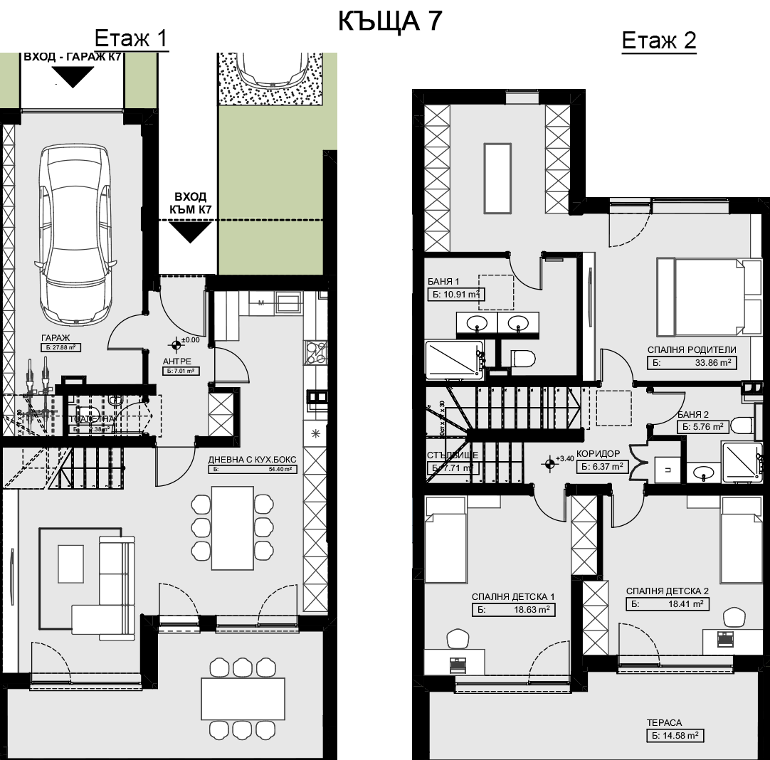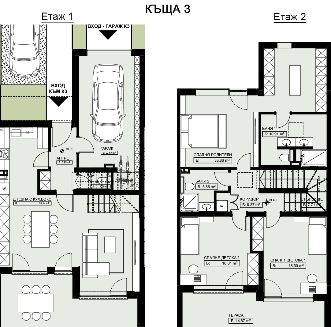 На първия етаж се разполагат гараж за удобно паркиране, антре, просторна дневна, кухня и тоалетна.