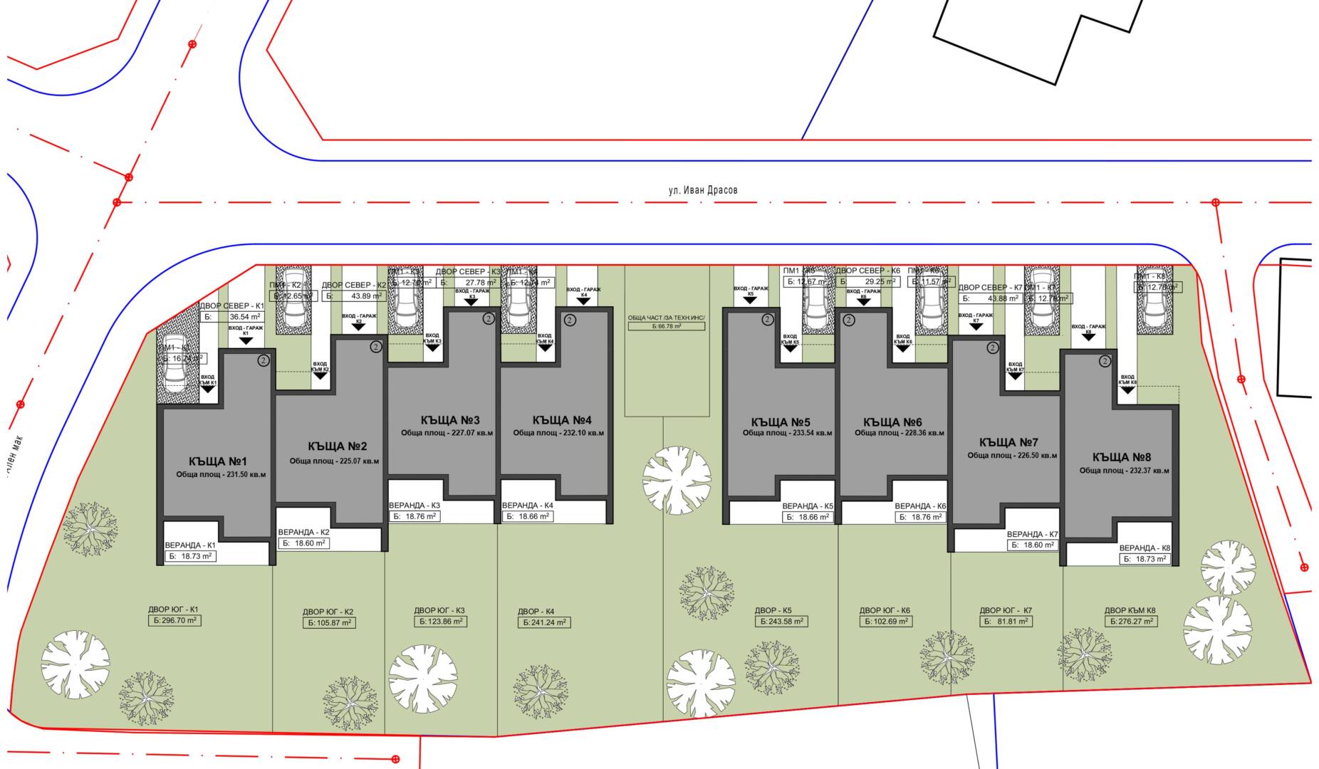 Към всяка къща е предвидено свободно дворно пространство с площ от 180 кв.м. до 320 кв.м.